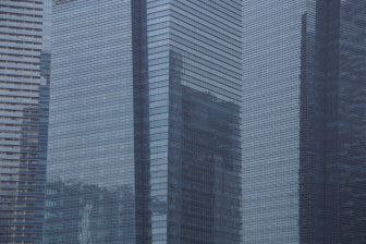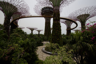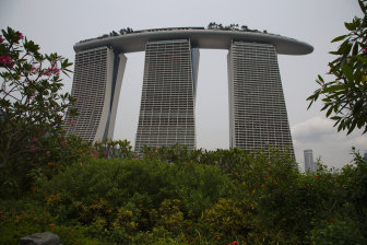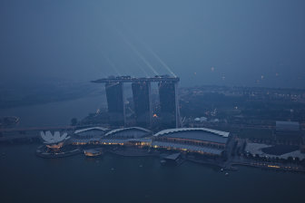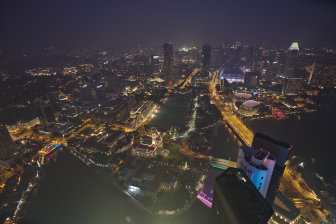 Taken at the rooftop bar 1-Altitude, which was pleasantly empty on a sunday night. The haze visible in those pictures covered the city the entire time of my stay and was caused by large wildfires in Indonesia.