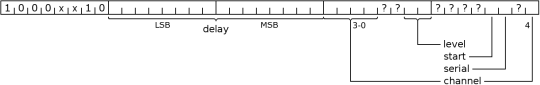 Are five bytes long. The first byte contains the opcode. The bytes are displayed in the order in which they are sent to the serial port starting left. The bits within one byte are displayed most significant first.